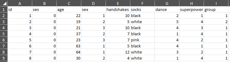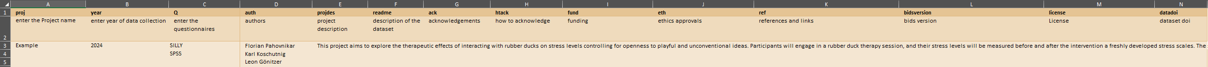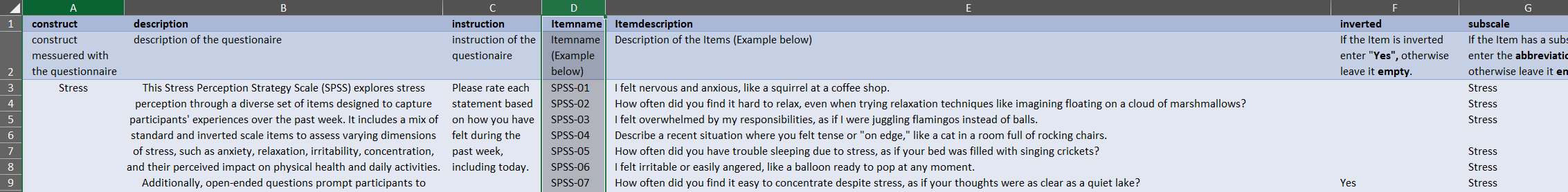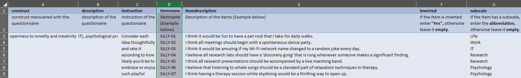 In this example, the project uses the questionnaires “Silly” and “SPSS.” Additionally, demographic data, such as age, sex, handshakes, socks, dance, superpower, and group, were collected outside the questionnaires. Be sure to carefully read the headers in the template and fill in the information accordingly.