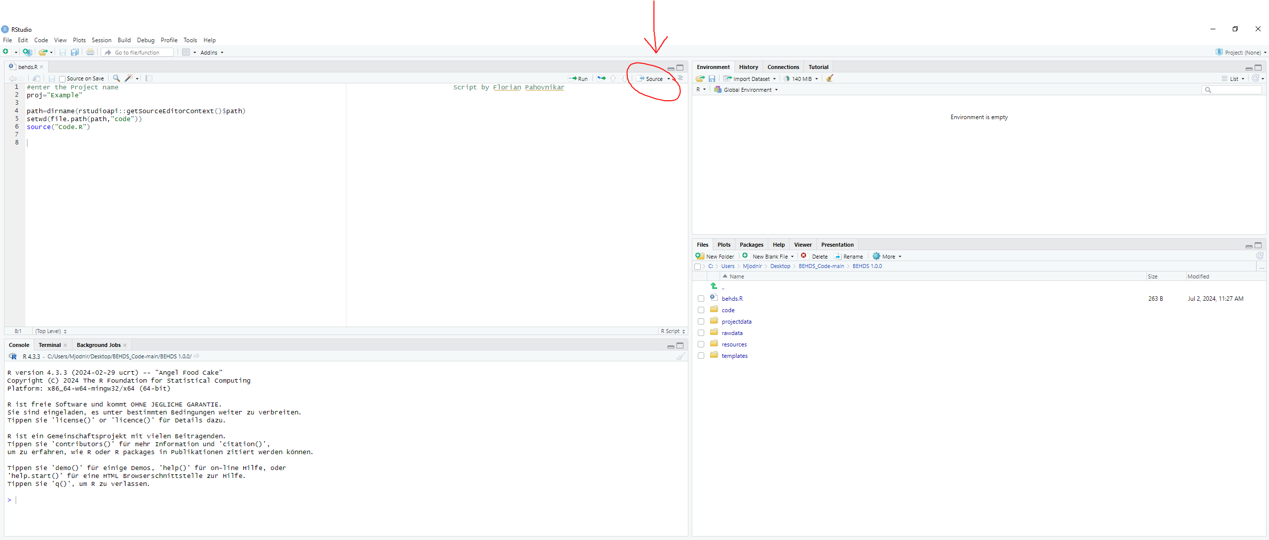 behds.Rin RStudio. The file is located in the root folder,BEHDS 1.0.0. - On the second line of the script, enter your project name: